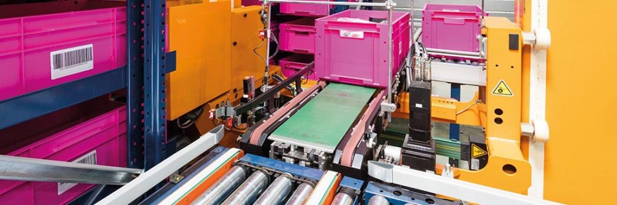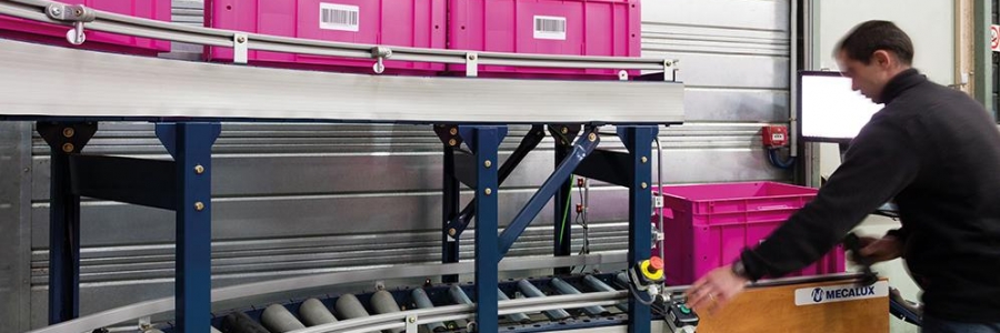 Deux circuits de convoyeurs reliés au magasin miniload ont été aménagés. Les caisses vides, provenant de la zone de picking, arrivent par le circuit supérieur. L’opérateur les remplit avec les articles correspondants, et les dépose dans le circuit inférieur pour les stocker à nouveau dans le miniload.